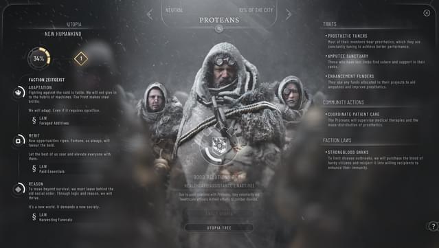 Fractured Utopias is an enormous bonus to the Frostpunk 2 experience, it's evident that there's been great care in creating this DLC. The faction skill trees aren't incredibly deep but varied enough to give enticing tools without being inaccessible. For example you can choose to focus on boosting exploration and outposts as the Menders or giving bonuses with hubs. You can also do the same as their rivals the Venturers at the same time, which is a nice touch. Speaking of Hubs, they're 3 tile centrepieces for your cities, granting bonuses to surrounding tiles and drastically changing the way you plan your cities. Menders give food production via a 'herd' mechanic slowly building up a stockpile of reindeer which you either milk or butcher when needed. They can also be spent for goods production or making exploration quikcer. Venturers on the other hand boost both goods production AND consumption, giving bonuses to heatstamp earnings based on the amount of goods consumed. One of the nice touches I noticed was that for the Venturers if you enable the ad campaign, you actually get in-universe ads either in your notifications or in call outs which made me chuckle. There's unique laws alongside the 'moderate' laws added in the update and traits added to each of the major factions as well such as Menders not giving or accepting heatstamp funding. There's a lot of details that radically change the way you play based on which faction you choose to enable. This is an 'early' review in the sense that I haven't experienced everything that is on offer such as the premium tales and other factions but I'm looking forwards to playing them and what I've experienced so far feels meaningful.
