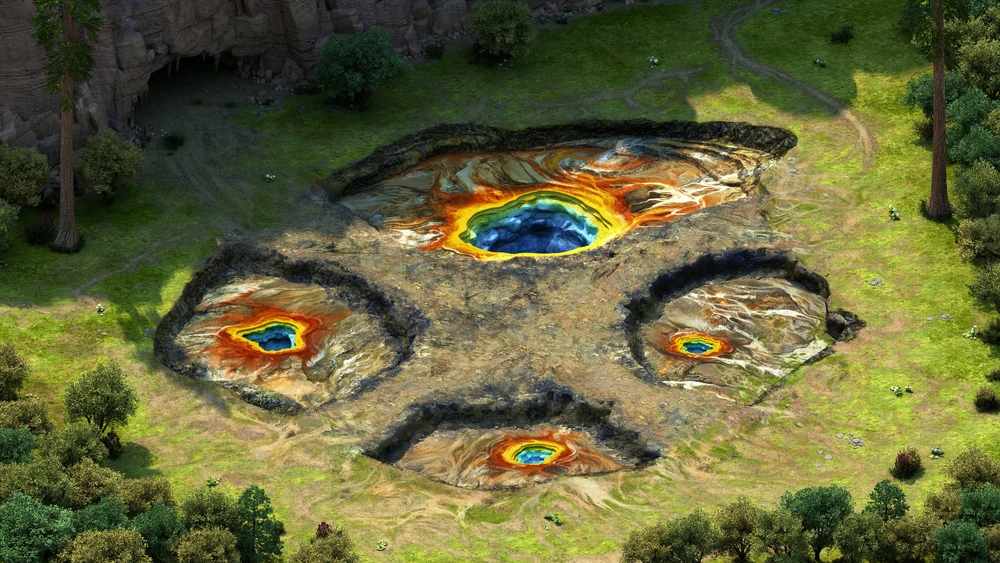 That is why I am not sure whether I have just completely misremembered the scene from that game, because I had little to compare it to at the time, and so elevated/cleaned it up in my mind, or if it just is from an obscure game, or if I am remembering snippets from multiple games, such as the four pool setup from Pillars, the colorful nature of the pools in Dark Sun, and then some other games that had yellowstone style hot springs in them, so I changed the colors to to those, and it all came together into one image that my brain insists comes from the same game :P