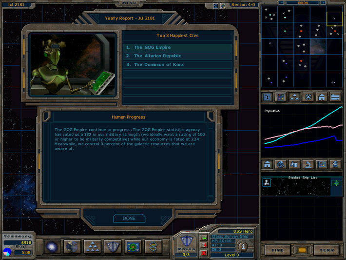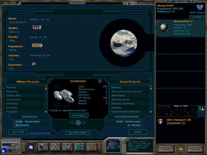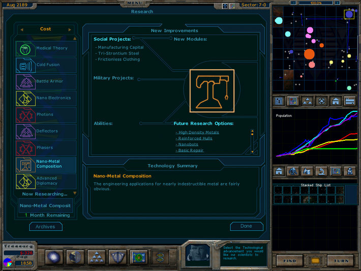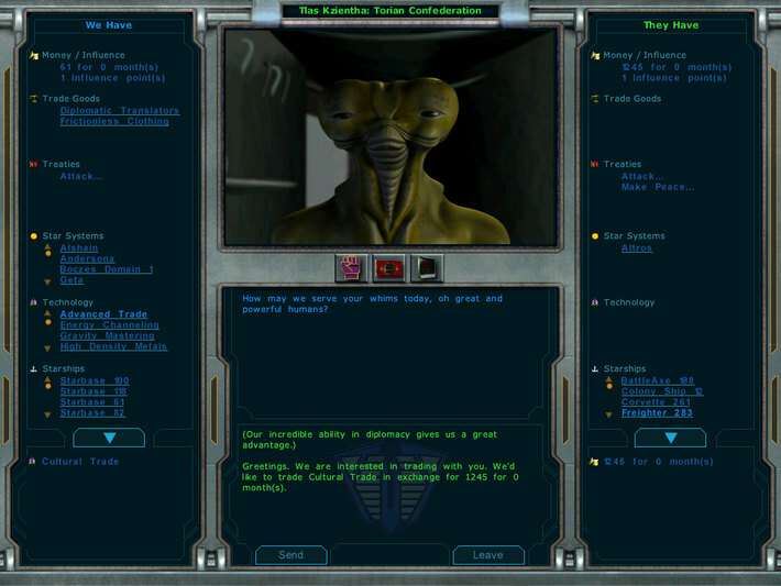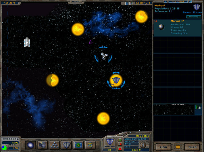 À propos : The year is 2178, the Terran Alliance has invented a new technology -- Hyperdrive. But the secret has leaked to the other civilizations starting a race for all the inhabitable worlds in the galaxy! As leader of United Earth, you must research new technologies, build an economy, create a powerful military force, all the while carefully balancing your political, diplomatic and trade skills.