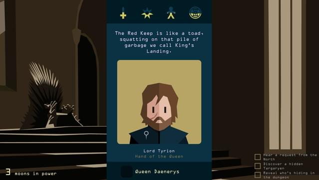 Impose Your Will: Swipe left or right to change the fate of the Seven Kingdoms forever as you hear the impassioned pleas and unpredictable demands from the people of Westeros. If a particular character becomes bothersome, tear their card in half to unburden Your Majesty with their concerns – but at what cost?